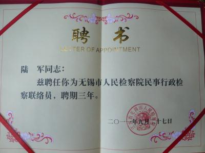 江苏汇方律师事务所主任陆军律师被无锡市人民检察院聘为“民事行政检察联络员”,聘期三年。这既是汇方所的荣誉也是汇方人的责任,陆主任表示一定认真履行职责,积极发挥自身作用,做一个名副其实的检察联络员!