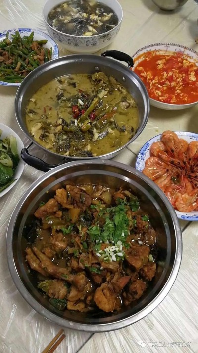 一起忙活。我开始洗鱼、削鱼片, @张燕梅帮我择菜洗菜洗锅洗碗,@吴晓东帮我淘米,找调料。。。我们的美女行政@陆华也没闲着,前前后后,左左右右的忙着给我们拍照,她说这些精彩而又美好的时刻一定要保留下来,是我们律所文化的一部分。。。在这里我要简单说一下第一个菜 ,酸菜鱼。 这是很多人爱吃的一道川菜,流传全国各地,也融入了各地的本土风格。怎么做的合口味,确实各人有各人的做法。我自己做过多次,看视频,上网查资料不断改进, 期间我还特意借去买酸菜鱼的机会去问过人家的厨师。在把鱼骨油煎而后炖汤半小时至汤成奶白色后,我把鱼片放淀粉鸡蛋清料酒抓匀腌10来分钟,于是重新起锅炒酸菜下作料,加炖好的鱼骨汤,炖15分钟左右下鱼片,鱼片最好削成蝴蝶状,这样易熟而且美观,放葱和香菜后出锅,热锅热油淋上干辣椒和花椒即可。在伙伴们的帮助下我迅速又顺利的做好了烧鸡公、白灼虾、小炒肉、酸辣土豆丝、西红柿炒鸡蛋、炒生菜、紫菜蛋汤等。很快一桌搭配合理而色香美味的午宴全部搞定。