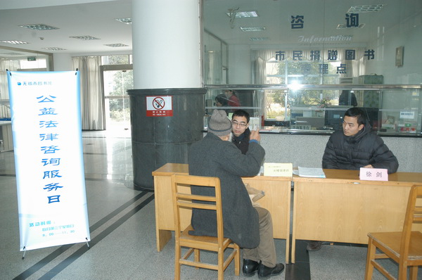1月20日,“公益法律咨询日”活动在我馆一楼大厅举行。江苏汇方律师事务所的律师刘修银、徐剑来到图书馆为市民做义务法律咨询,律师就市民提出的各类问题作了详细解答。