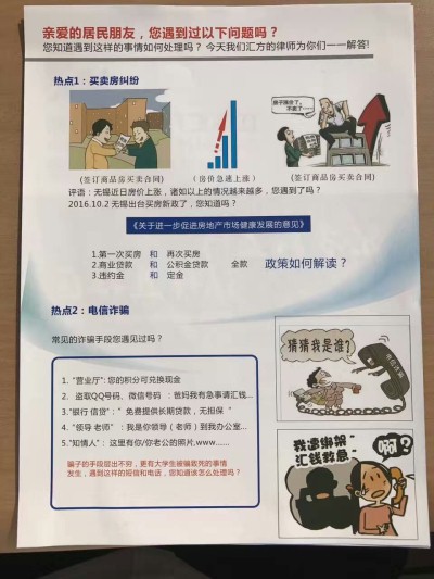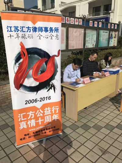 2016年11月5日,江苏汇方律师事务所与春星社区居委携手举办送法进社区活动如期举行,这天阳光明媚,秋高气爽,汇方所的几名律师早早的来到春合苑小区门口,为这里的居民解答法律发面的问题。现场咨询人头攒动,律师们热情接待,社区居民群众纷纷表示希望以后能多搞这样的活动,汇方所以后一定会多多举办公益活动,为大家答疑解惑,这就是我们汇方所一贯坚持的,10年公益还会持续不断,另一个10年,再一个10年……